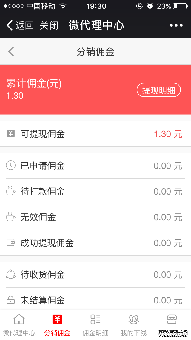 • 傭金管理支持按照分類查看傭金審核:待審核、待打款、已打款、無效提現(xiàn)等;支持分銷商查看傭金總額及明細(xì)